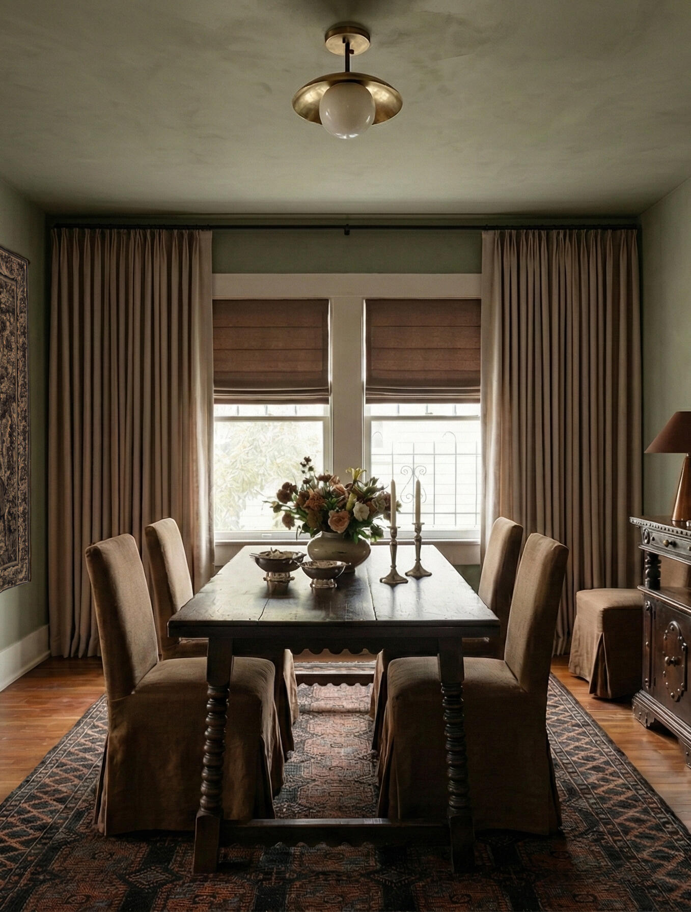 In this Northern California home, the dining room and reading nook were refreshed with traditional sensibilities and modern polish. The dining room’s muted tones and warm woods elevate the original architecture, while the reading nook uses rich, earthy tones and layered patterns to feel both grounded and inviting. Every inch was designed to accommodate hosting without sacrificing style or space.
