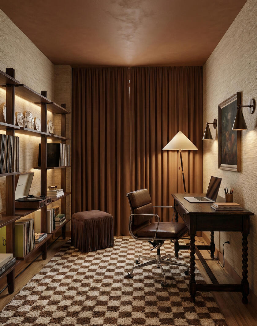 This NYC apartment was redesigned to balance drama with elegance. The living room took on a rich transitional style with vintage and modern pieces in Bordeaux tones and silver accents, perfect for hosting with flair. The office shed its clutter and took on a bold theatrical edge, marrying deep hues with smart, modern storage. Both rooms now flow beautifully in function and aesthetic.